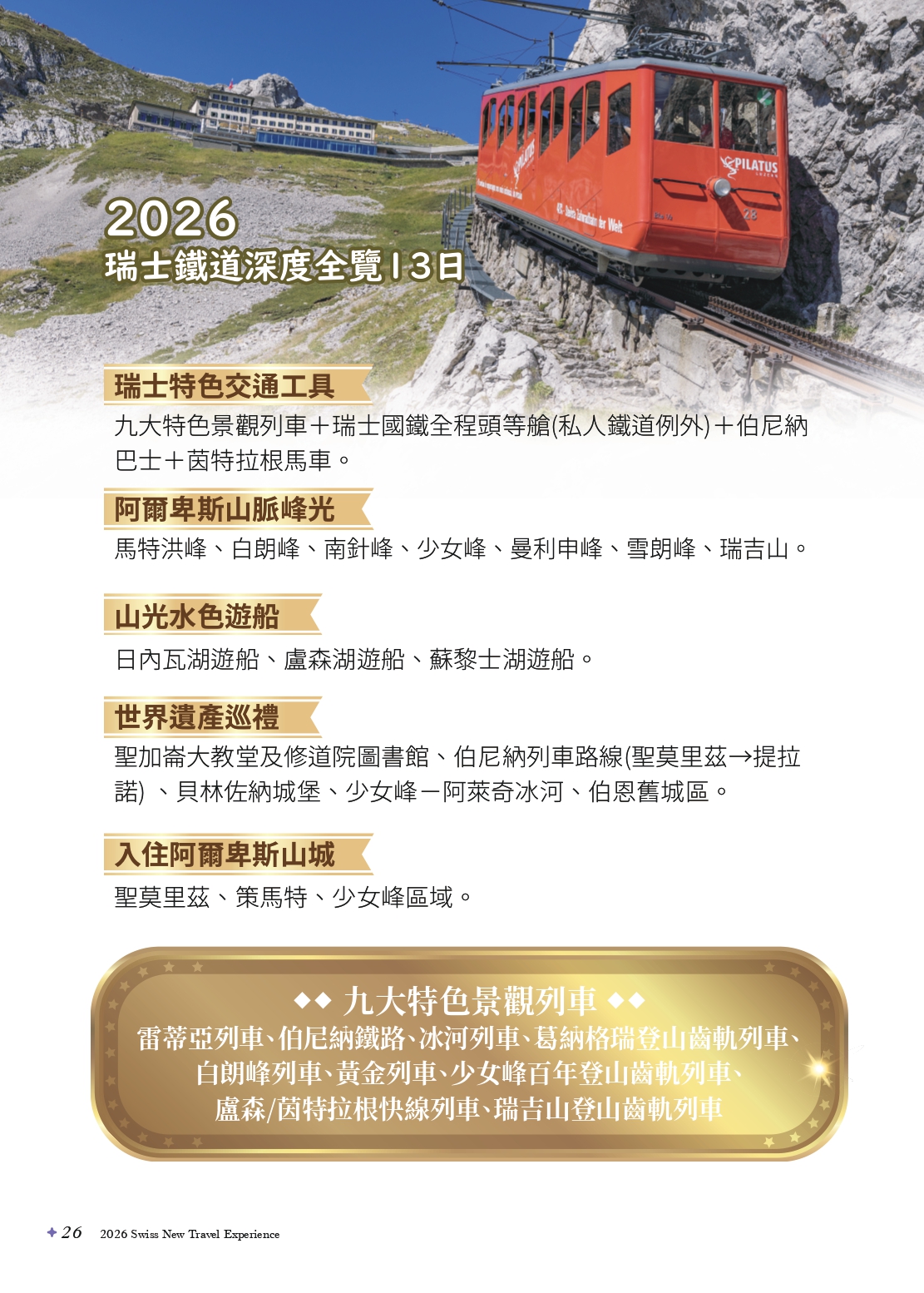 ※ 如遇冰河列車客滿或停駛,則改搭瑞士國鐵(中途需轉車),並且退費每人NTD 2,000,敬請知悉