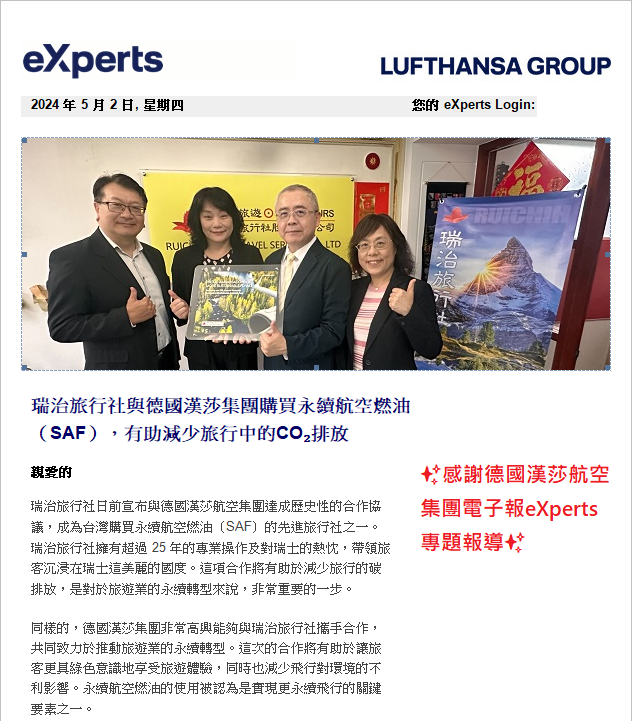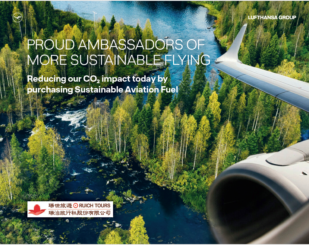 瑞治旅行社專注經營瑞士旅遊,亦支持瑞士的永續旅行理念,透過向瑞士航空隸屬的德國漢莎航空集團購買永續航空燃油(SAF),有助減少航班飛行的二氧化碳排放量,為永續旅行盡一份心力。