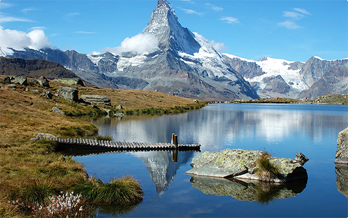 若想捕捉馬特洪峰最經典的身影,沒有比利菲爾湖更完美的地方了。這座高山湖泊位於海拔 2,757 公尺,距離葛納格瑞鐵路的利菲爾湖車站僅需步行片刻,便能輕鬆抵達。當天氣晴朗、湖面無風時,雄偉的馬特洪峰倒映在清澈湖水中,宛如一幅對稱的自然畫作,被譽為「瑞士最夢幻的風景明信片」。無論是清晨薄霧還是夕陽餘暉,湖畔景色都令人心醉。健行途中,您可沿著高山步道漫步,欣賞壯麗的雪峰。這裡不僅適合攝影愛好者,也是旅人感受阿爾卑斯寧靜與純粹的最佳去處。※ 利菲爾湖健行若因天候不佳或積雪未融,領隊基於安全考量,可能會取消健行,敬請知悉