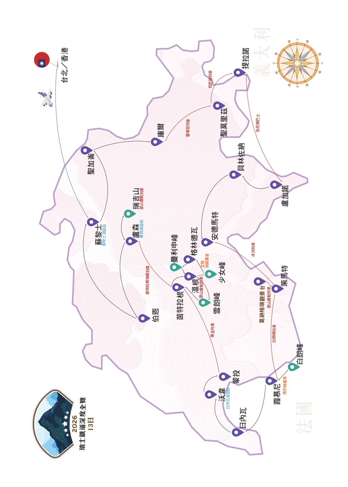 瑞治旅行社非常榮幸能夠為您服務,希望再次帶給您與眾不同的瑞士深度之旅。早餐:機上簡餐 午餐:機上簡餐飛行時間:香港→台北約1.5小時